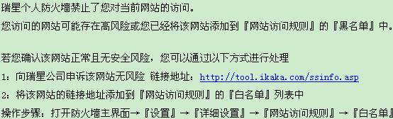 请教高手如何让某些网站打开,经常有些网站出现这种情况。我也把地址添加到白名单中,但是还是这样进不去。瑞星防火墙级别是中级。