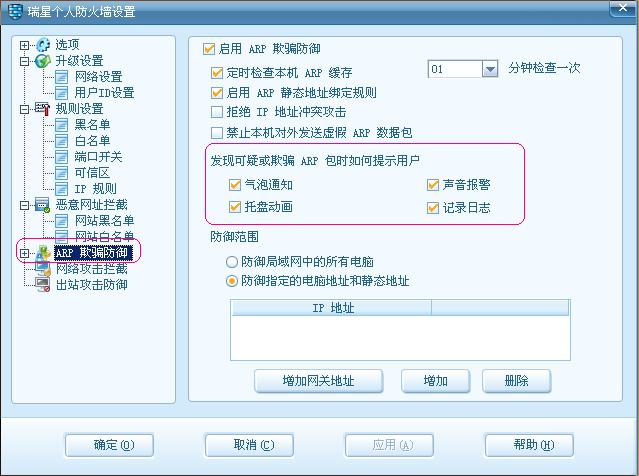 防火墙的提示有三个位置可以设置,一个是详细设置中的高级设置中,一个是ip规则设置,还一个是arp欺骗里。