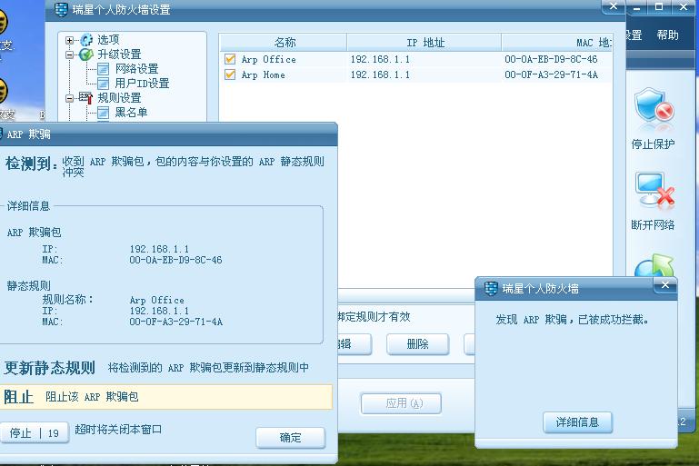 强烈要求,瑞星防火墙的arp欺骗防御严重不好用,建议修改!