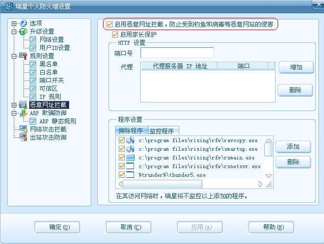 我电脑装的是瑞星个人防火墙,不知道从什么时候起打开网页很多图片就显示XX,然后上网求助,用了很多办法都没用,后来有人讲是瑞星个人防火墙2009里面的恶意网址拦截搞的鬼,我试着关了它,果然好了~~~~~~~~可是每次重启电脑过后,恶意网址拦截又自己打开了,怎么解决这个问题?或者能告诉我到底怎么弄才能让我开着恶意网址拦截又能正常显示网页图片????