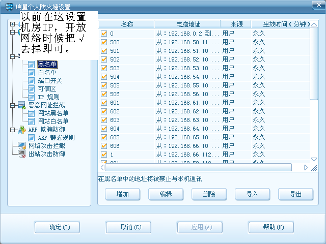 缘由:我们机房通过一台代理机上网,为了能控制各机房网络以前用瑞星2008防火墙,在黑名单中添加各机房IP,要开放网络时把把黑名单去掉即可(安全级别为中级)。前几天我把防火墙升级为2009版后发现,机房的机器通过代理无法上网了,即使我把黑名单去了(本代理机能正常上网)。