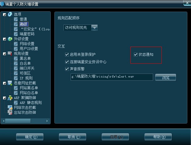 那个防火墙的红黄灯报警在哪里可以取消掉,我在设置里转了一圈没找着,好像把级别调到最高后就不报了,不知道为什么,请指教!!