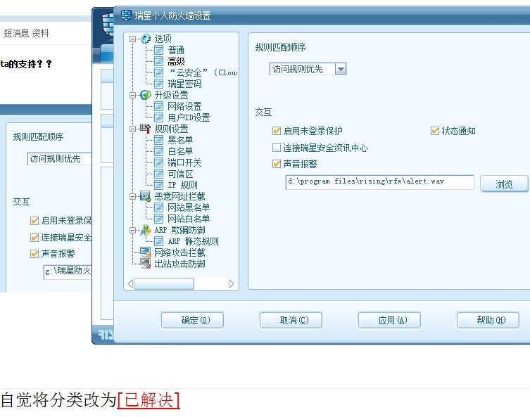 我有个疑问,以前一直用xp,防火墙很正常,新安装了程序第一次用瑞星都会按照规则自动放行或者提示我~