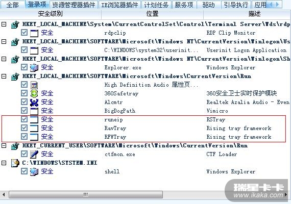 安装了哪几种瑞星软件,它们的版本是多少,看看开机启动项里,有哪几个瑞星相关的