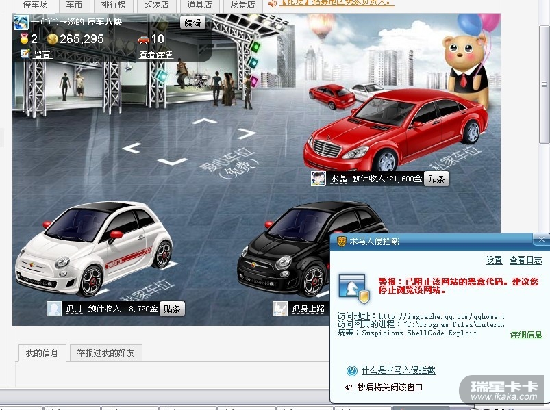 急~~我的瑞星防火墙把我的QQ抢车位拦截了,现在进不去了,说是有木马要侵入,怎么办啊?下面是我截的图,还请高人指点,本人在线等,xiexie l