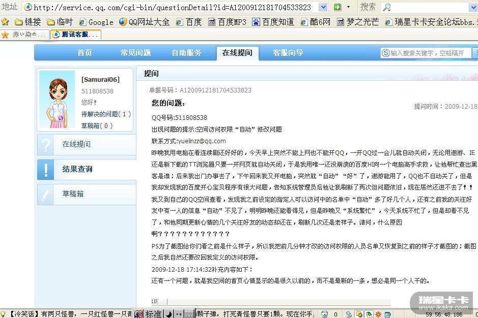 您的问题:提问时间:2009-12-18问题还是有部分没有解决,点主页统计下面的刷新后首页心情是更新了,但关注好友动态还是查看不到。我的密码是非常复杂的16位,完全没有任何规律的,而且我每次登陆都有用小键盘,而且这个密码也是前阵子才改的,你们那里应该也有记录;IE缓存我一直设置是1M、且关闭时自动清空,密码、表单等也经常手动清空,刚刚也手动清空了一下缓存还有其他所有的东西;自动完成功能这台电脑从装机开始就从来没有开过;个人资料模块从开空间以来始终都是勾选状态。