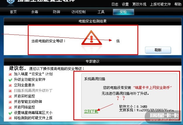 那位高手可以帮我看下啊.现在瑞星杀毒扫描出来的未修复的安全设置.在卡卡助手那里点不开的.请大家解决一下.