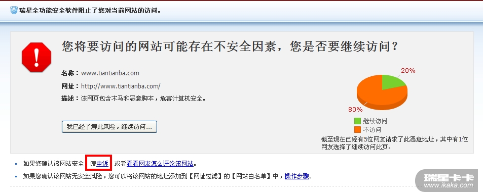 前段时间做广告联盟的CPM广告,由于弹出来的广告带有病毒,导致我网站也跟着受累,被瑞星和360拦截。发现这一情况我及时中止了CPM广告投放,同时向360提交申诉,二小时后360把我的网站解封,但瑞星却是无从申诉?
