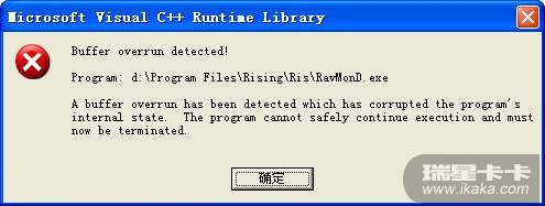 这是缓冲区已发现有损坏程序,你的瑞星ravmond.exe文件可能受损了.建议把它卸载后重新安装瑞星。