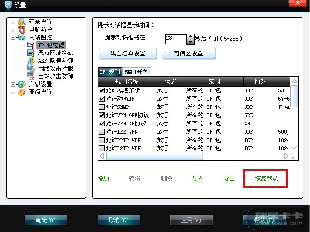 在“IP包过滤项”中选择“恢复默认”,就可以将你以前的设置过的删除。不过最好请楼主提供截图供我们分析。