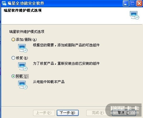打开开始菜单/程序/瑞星/修复,可以看到“卸载”选项,如图