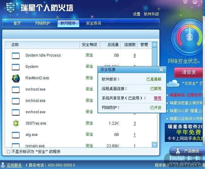 我的电脑安装的是XP SP3,安全软件有:瑞星2011个人防火墙+360杀毒+360安全卫士+360保险箱,问题是:我的电脑并没有文件或文件夹共享,系统默认共享都已经关闭了,但是每次开机,我打开防火墙都会看到瑞星2011个人防火墙提示“请修复”,点击看看说我“系统共享目录已启用”,点击“禁用”后,重启电脑还是会出现同样的提示,请问瑞星工程师这是什么问题?还有,防火墙好想没有自我保护功能,能在进程中结束!!!