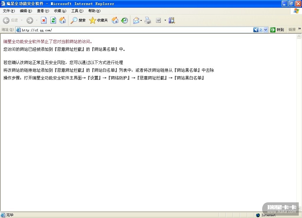 本地测试,http://cf.qq.com/加黑名单后,瑞星可以拦截。如图1。