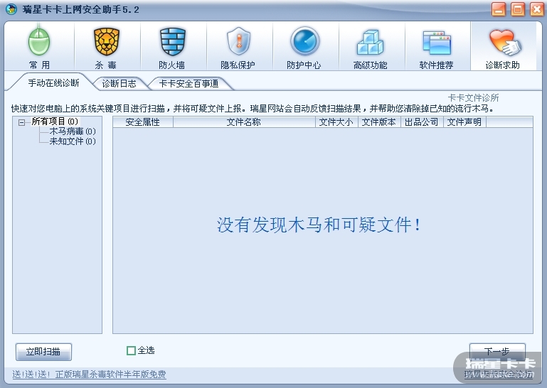 今天升级卡卡后,在“常用”标签下,扫描发现三个盗号木马!!!但用卡卡的“诊断求助”,却显示“没有发现木马和可疑文件”。用360安全卫士、卡巴斯基以及大蜘蛛都没有发现木马。奇怪!!!!不知如何贴图