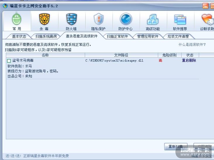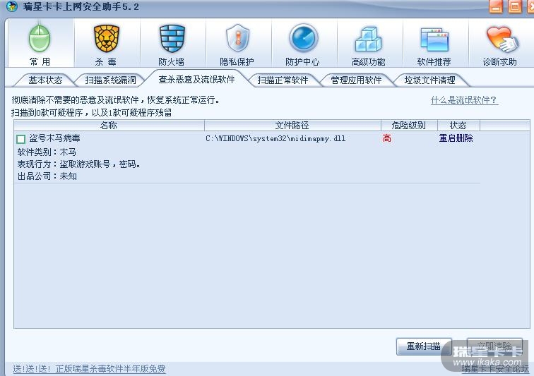 这个到底是什么东西?360.诺顿等等包括瑞星自己的杀毒软件都杀不出来!!!但卡卡提示是盗号木马!系统做了无数次,只要一上游戏就出这个MIDIMAPMY。DLL的文件,里面还是空的,打开提示不存在,到底是什么??要真是木马,都快半个月了瑞星还是没出专杀工具吗?瑞星的老大啊,我这游戏花了不少的RMB,我用瑞星就是信的过瑞星,这到底是出什么问题了?另:系统XP正版.补丁齐全,没下任何多余的软件,不上游戏没有,登陆游戏就出来了,我好怕怕啊,丢了损失就大了。拜托,这到底是什么东西?