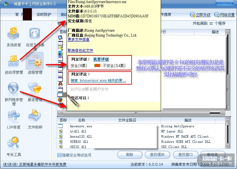 但是新系统的问题也很多,比如图上的进程就清楚的说明一些恶意提交对真个云系统带来的负面影响(你真的安多数服从少数禁止这个进程KAKA6就...),这已经不是计算机安全所能解决的了,当然相关的预防方法已经提交给瑞星官方相信今后瑞星会对此进行相应的改进...