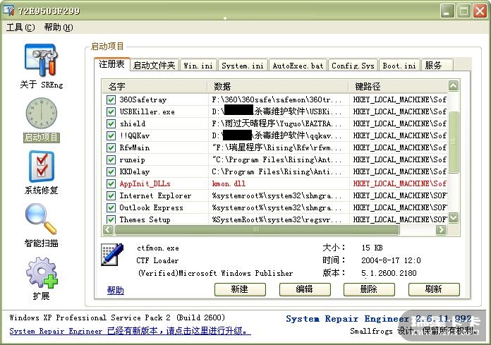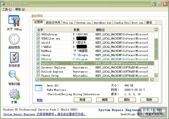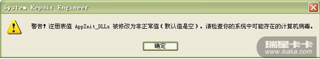 我昨天下载了最新版卡卡,界面很好。安装后进行了检查,发现SRG认为卡卡是病毒!提示AppInit_DLLs有问题