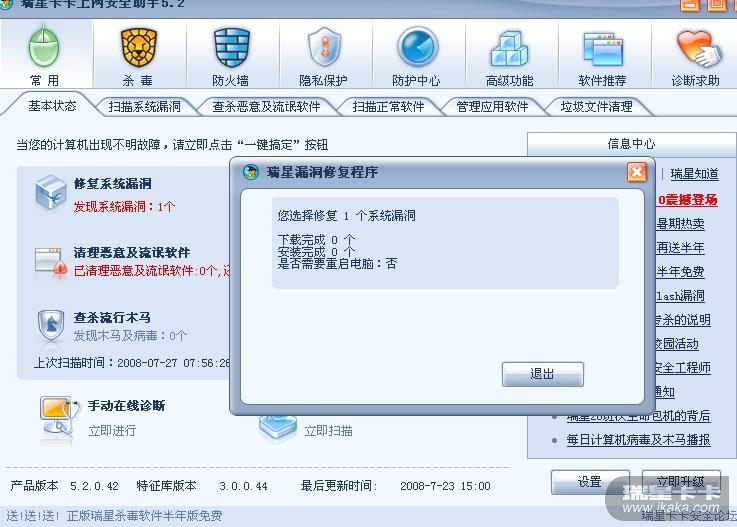 卡卡上网助手-实时防护-本机防护-自动修复系统漏洞