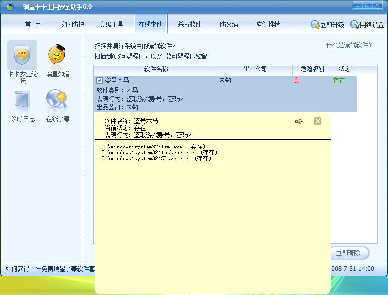 我是瑞星的忠实用户,花了RMB买了一套正版瑞星杀毒,推荐安装卡卡上网助手6.0,还有很多的实惠就安装了,结果今天扫描扫描恶意软件,发现3个盗号木马,赶紧使用卡卡上网助手给清理掉了。