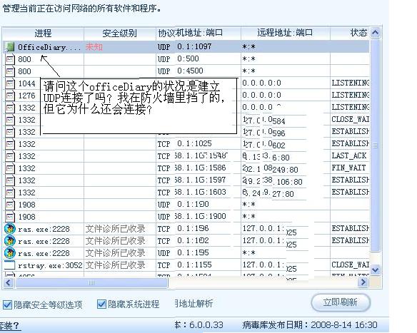officeDiary这个程序是自动有上网请求的,但我在防火墙设置里将它禁止上网了,各种模式下都是禁止,收发邮件也是禁止,全部禁止。可是我不知道为什么每次都有它在联网程序中显示?