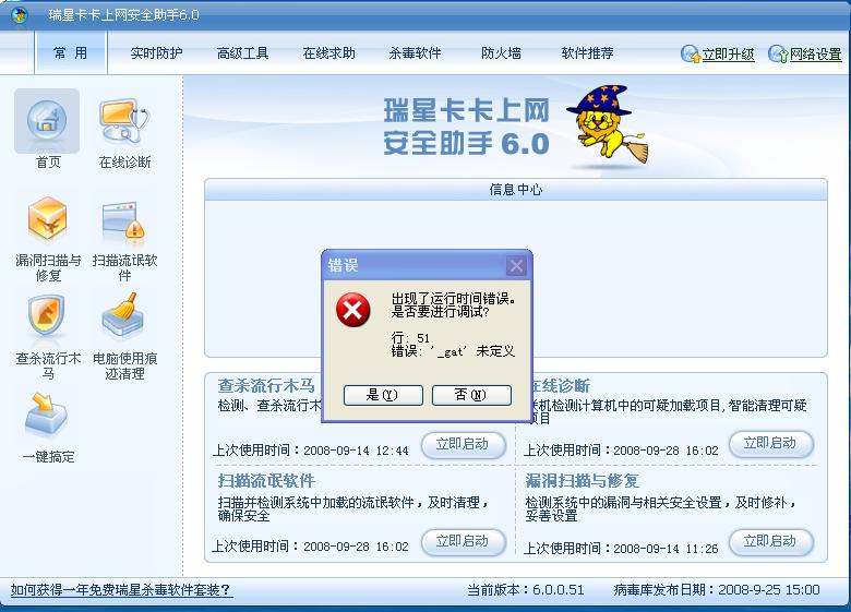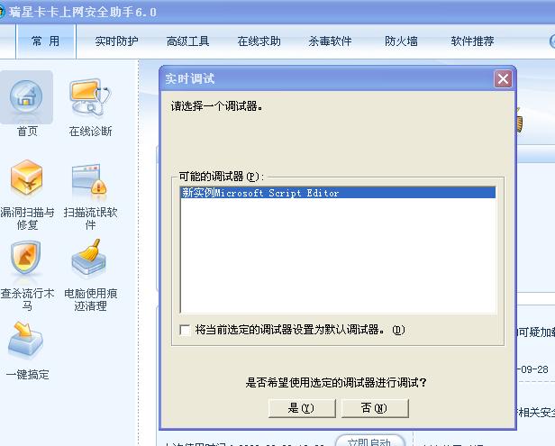 我一打开卡卡上网安全助手,或者打开后,点击其他功能,就会弹出个筐,时间错误,要调试的(如图),这到底是什么问题,我电脑中毒吗??