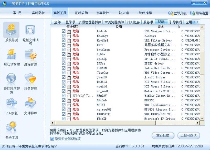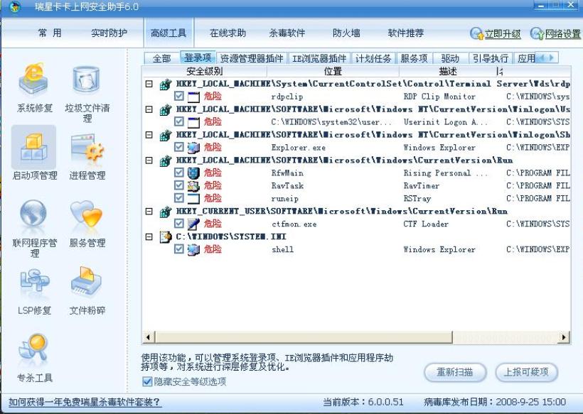 用卡卡查 登陆项 服务项 驱动 资源管理器插件 IE插件 99.9%都显示危险