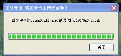 请问大虾: 我在升级卡卡时,提示"下载文件失败,comx3.dll.zip,错误代码:0x0(check),为什么啊?晕,怎么升级呢?