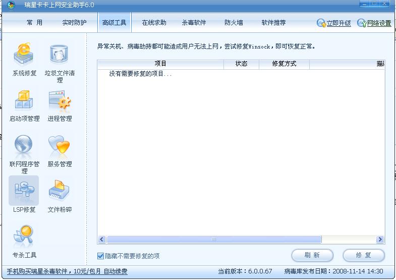 什么是LSP?),当杀毒软件把病毒或者木马清除之后,被劫持的LSP并没有被恢复,所以需要用到瑞星卡卡安全助手高级工具的[LSP修复]功能。