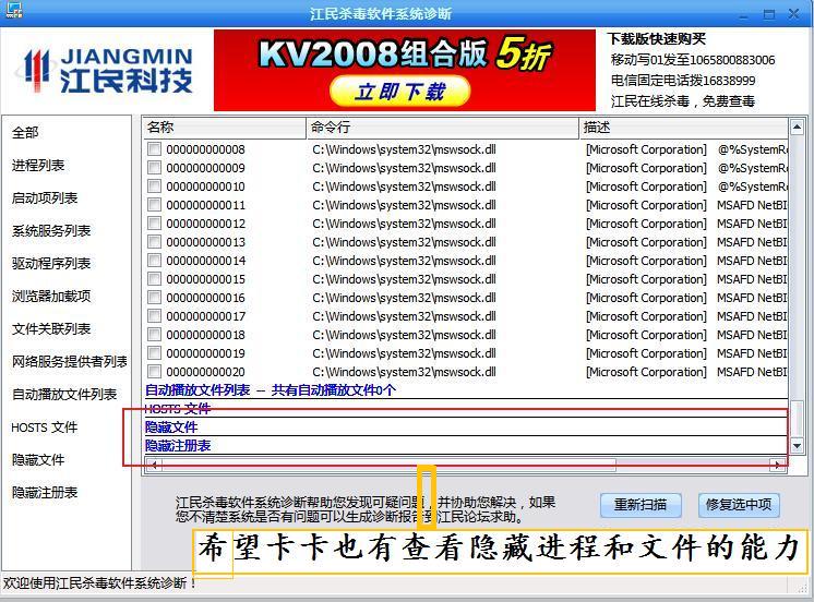 而现在试用江民发现其在反rootkit方面很好,建议卡卡改进!!!