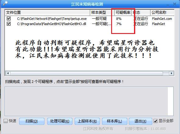 瑞星听诊器---------------希望瑞星听诊器也能像江民 的未知病毒分析工具一样使用行为分析引擎,毕竟 只要用一款新的 安全厂商未截获的加壳工具或加花工具修改已知病毒,杀软就不认识了!!!只有通过行为分析,不论你是男孩是女,穿裙子还是牛仔裤(伪装或修改特征码),只要你做坏事,我就抓你!!!