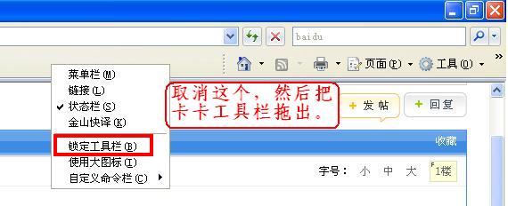 如图所示,瑞星卡卡工具栏只能显示少的可怜的一部分,原来用IE6的时候就有这个问题,现在换成IE7还是存在这个问题。卸载重装不行,在工具栏处对瑞星卡卡工具条重新勾选,还是在原位置,也不行!我的系统版本是WIN XP SP2,浏览器版本是IE 7.0.5730.13 。不知如何能够解决此问题,请各位高手赐教,谢谢!!!