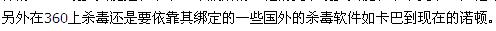 去年360推出永久免费闹的沸沸扬扬,宣传其有多么好,这其实并不是我所关心的,因为我的想法和瑞星高层表态的看法是一样的,360最多只能是和卡卡一个级别的,他的竞争最多只能和卡卡竞争,但他却要混淆是非,这是我所不能接受的。另外在360上杀毒还是要依靠其绑定的一些国外的杀毒软件如卡巴到现在的诺顿。对于这些杀毒软件还是要收费,并没有真正做到免费。最让我心疼的事曾经在360上看到一篇文章:国内杀毒软件前10排名。。我看到这我就想依附于360的那个杀毒软件肯定是第一把,果不其然看了过来是第一,至今我都不记得那杀毒软件叫什么,听都没听过,卡巴、诺顿都排在其后,瑞星连前10都没有。想都不要想是为什么——这地球人都知道~!当时一时气愤去论坛跟贴抗议。结果可想而知,被删帖。从此对360真的彻底改观。。。