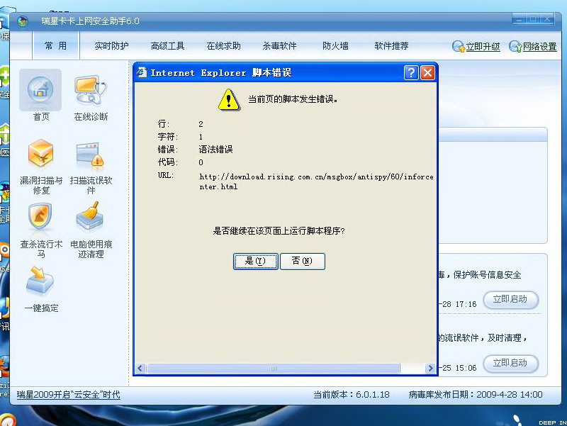 回复:我的瑞星卡卡怎么老是显示脚本错误是怎么回事?