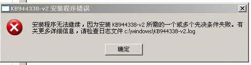 0.594: KB944338-v2 安装程序遇到了一个错误: 安装程序无法继续,因为安装 KB944338-v2 所需的一个或多个先决条件失败。有关更多详细信息,请检查日志文件 c:\windows\KB944338-v2.log