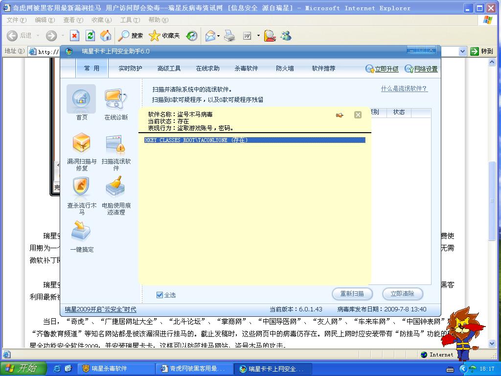 我的电脑每次使用卡卡的扫描流氓软件,就会然后就会提示发现盗号木马病毒,清理以后,以后再使用,仍然有这样得到提示,不知道是什么病毒?