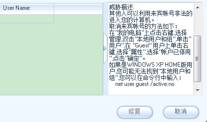 4)设置名称是“密码过于简单”,危险等级:★★,自动修复:否;  Vista系统不可以修复,有一些漏洞修复了你用电脑会不习惯的,不必修复,你感觉你需要修复的再去按照威胁描述去修复。