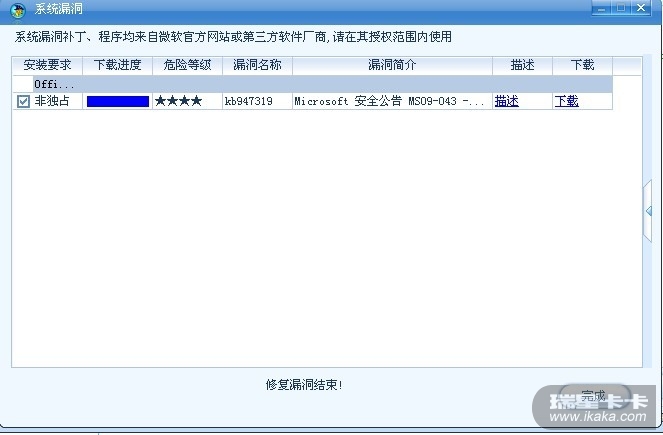 我试过了,结果是:“此更新已应用或者包含在了已经应用的更新中”(不好意思不知道怎样贴图)。我安装了一个文件而在控制面板添加或删除程序中,却显示安装了两个文件,一个是KB947319:OWC10;另一个是KB947319:OWC11。这是什么原因?请瑞星工程师们研究一下。应该说这个补丁是已经打上了,现在的问题是怎样让卡卡不再报漏洞。
