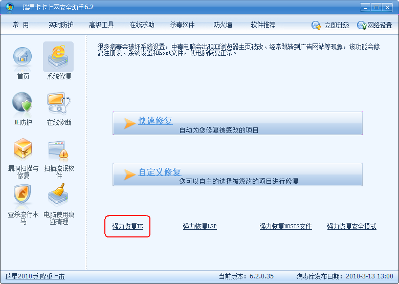 瑞星安全工程师通过分析发现,此类问题是由于操作系统中针对IE浏览器的注册表键值被病毒或恶意程序破坏所致,与之前发现的“1188”、“人体艺术”首页病毒问题类似。病毒通过劫持多款主流浏览器,将默认首页的注册表进行修改,甚至破坏系统正常运行。 对此瑞星安全专家给出解决方案:用瑞星卡卡上网安全助手6.2中的“强力恢复IE”和“系统修复”中的功能,可以快速将恶意程序破坏的系统功能进行自动恢复(卡卡上网安全助手6.2免费下载地址:http://tool.ikaka.com/)。