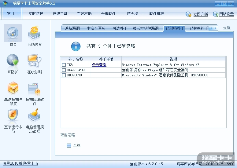 好长时间没有用过卡卡了,主要的原因就是卡卡的漏洞扫描功能和win7兼容性还不是太好(自我认为),好几次扫描的漏洞都提示不适合本系统,由于看着闹心后来索性删除了卡卡,不过说实话用了好几年的卡卡了,突然电脑里面没有了卡卡还是觉得少点什么,今天看见某个帖子有人说卡卡增加了补丁忽略功能,我想证实一下是否属实。还有如果我选择忽略之后那么用瑞星杀毒软件安全扫描的时候是不是还提示有漏洞呢。