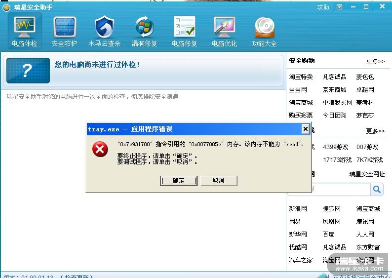 开机时弹出tray.exe应用程序错误对话框,,后来修复助手。打开助手时又弹出tray.exe应用程序错误对话框,按确定后,助手就没响应。