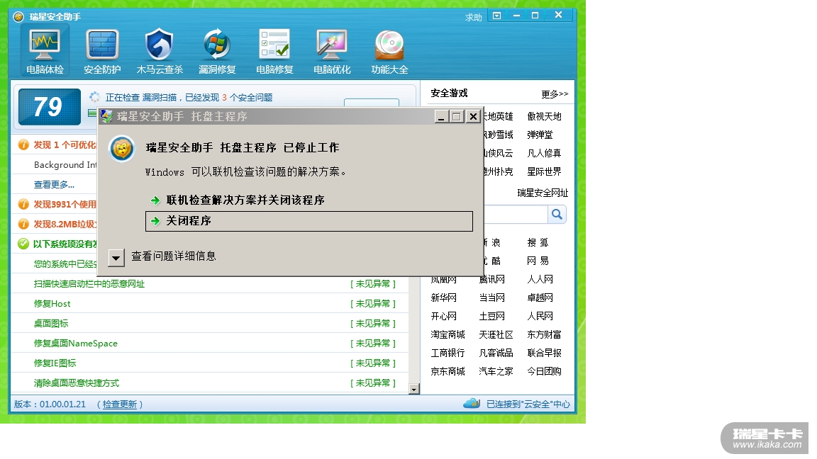 最近,瑞星安全助手的托盘经常提示:瑞星安全助手 主程序 已停止工作。而且,有时发现其占用的CPU竟然达到了50%左右。