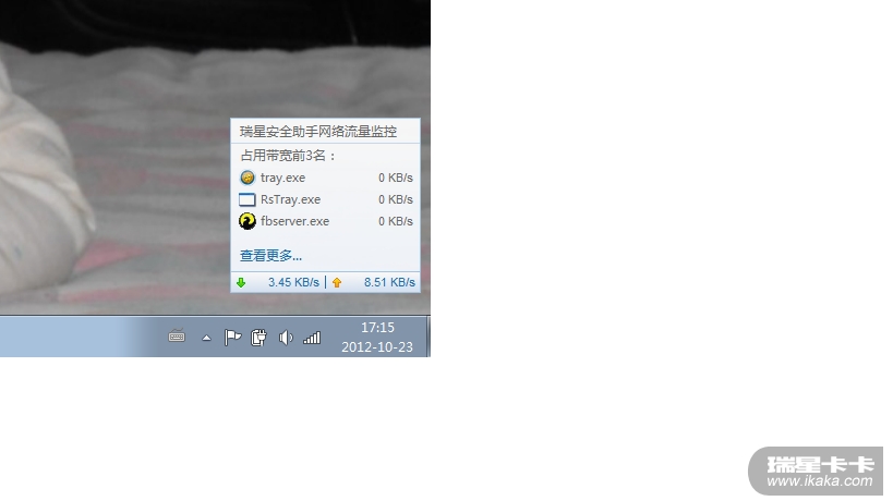 4.请提供瑞星安全助手流量监控窗口显示有数字在走,点开后显示的所有程序后面的数字都是0的截图看看,截图上传方法请参考:http://bbs.ikaka.com/showtopic-8616820.aspx