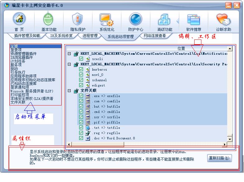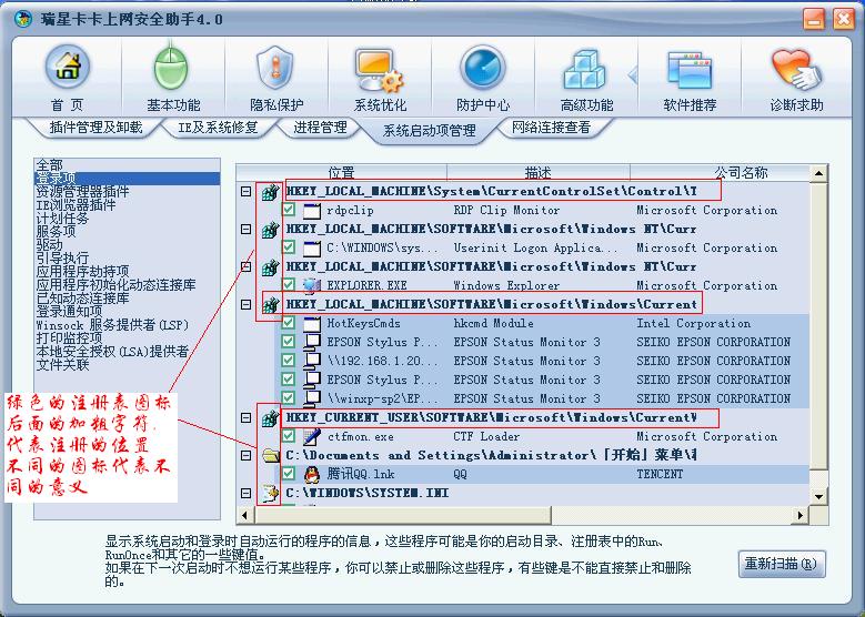 注明:因为卡卡助手的系统启动项功能很强大,错误操作可能会带来很严重的后果,所以,希望大家找出可疑启动项之后,最后是帖出日志或者是截图帖上来,大家分析之后再执行:禁止\删除操作,切记!