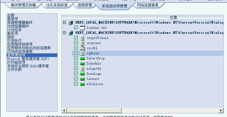 发现可疑项目,推荐到“数码硬件”或者“反病毒区”请高手人确认,方可禁止,假如禁止之后重启,一切正常就可以删除了。
