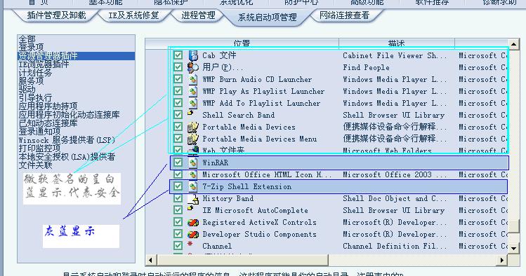 此分支多数是微软的插件(拥有微软的数字签名),呈白蓝显示,其它比较多见的常用插件有: