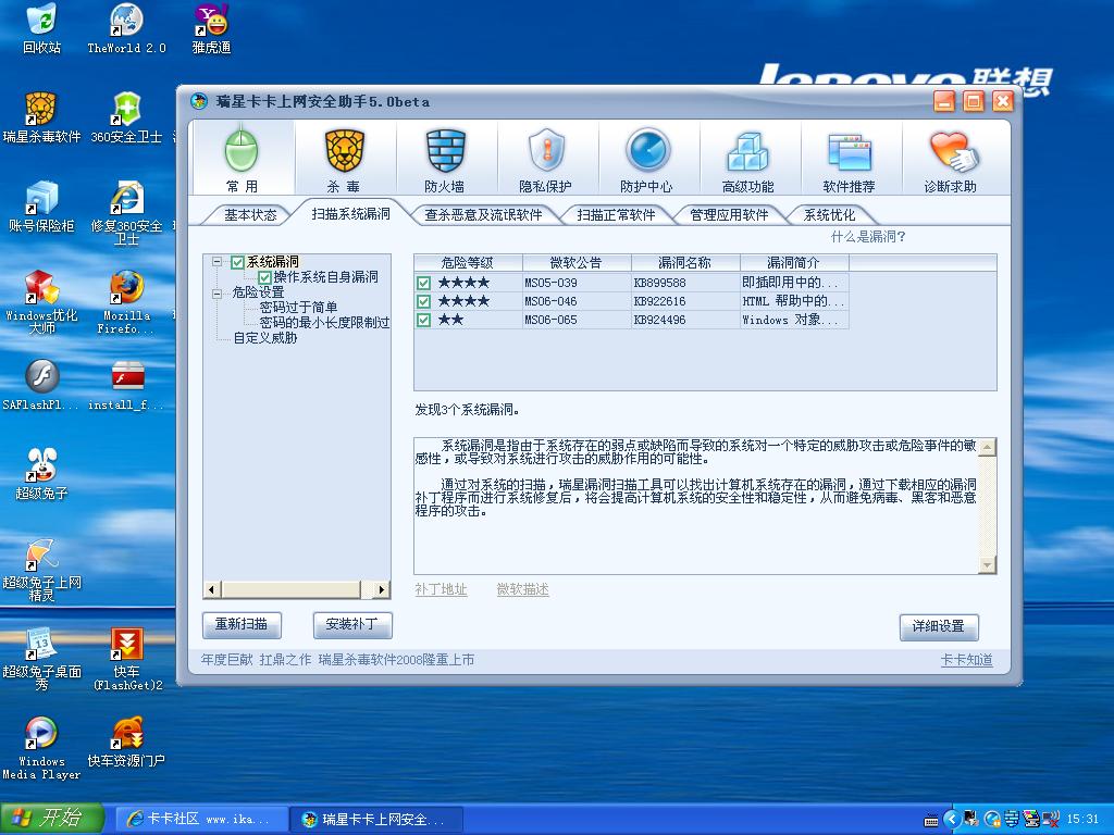 卡卡5.0扫描系统漏洞扫描出有2个漏洞,但用瑞星杀毒软件自带的瑞星漏洞扫描后无漏洞.