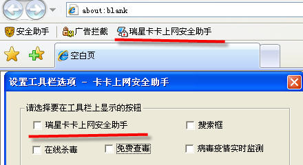 无论在图中的设置中是否设置显示“瑞星卡卡上网安全助手”,在工具条上总是会显示这个“瑞星卡卡上网安全助手”,而且设置里“瑞星卡卡上网安全助手”前面的哪个勾无法勾选(勾选后再打开还是没勾选)