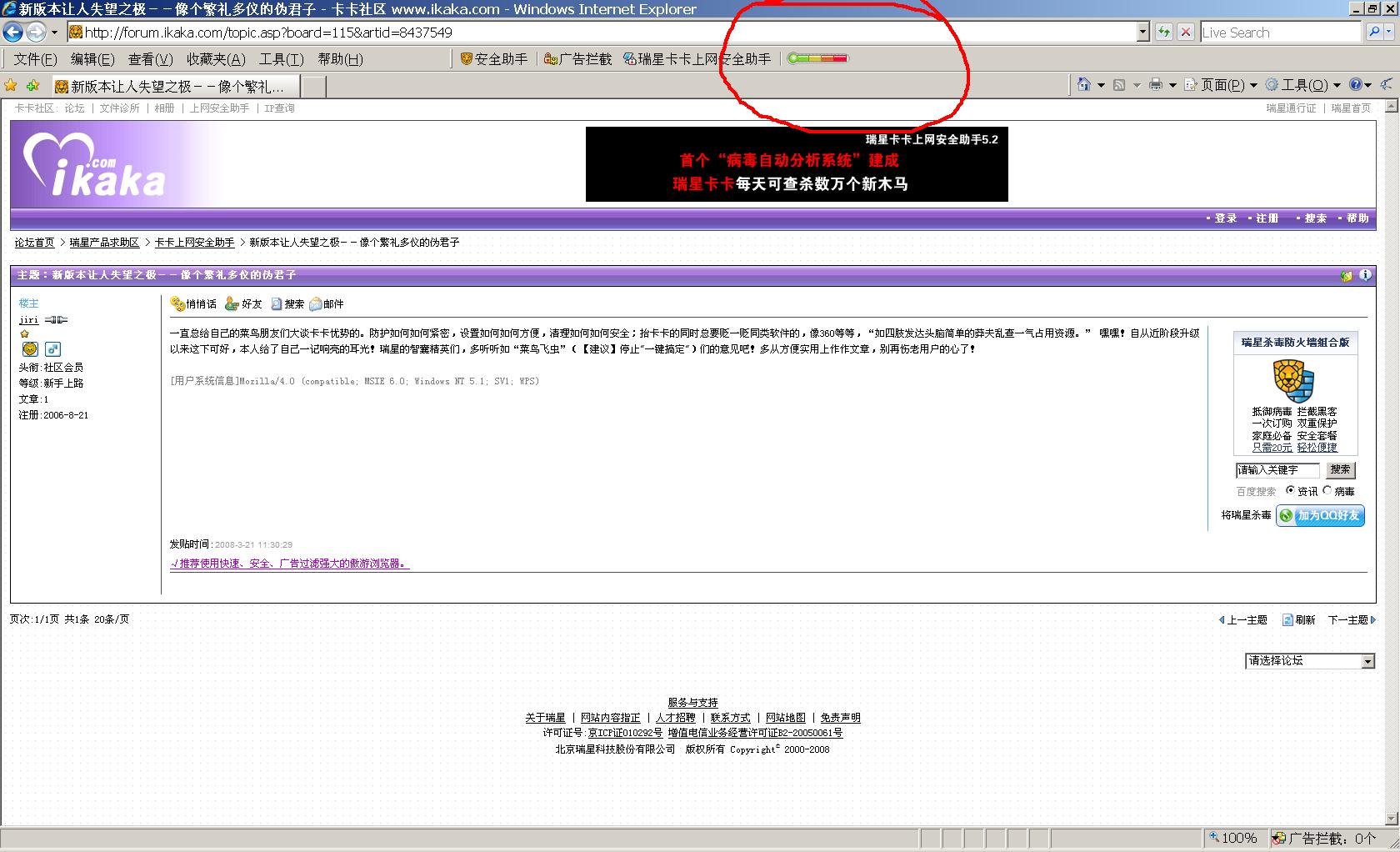 【jiri的贴子】一直总给自己的菜鸟朋友们大谈卡卡优势的。防护如何如何紧密,设置如何如何方便,清理如何如何安全;抬卡卡的同时总要贬一贬同类软件的,像360等等,“如四肢发达头脑简单的莽夫乱查一气占用资源。” 嘿嘿!自从近阶段升级以来这下可好,本人给了自己一记响亮的耳光!瑞星的智囊精英们,多听听如“菜鸟飞虫”(【建议】停止"一键搞定")们的意见吧!多从方便实用上作作文章,别再伤老用户的心了!