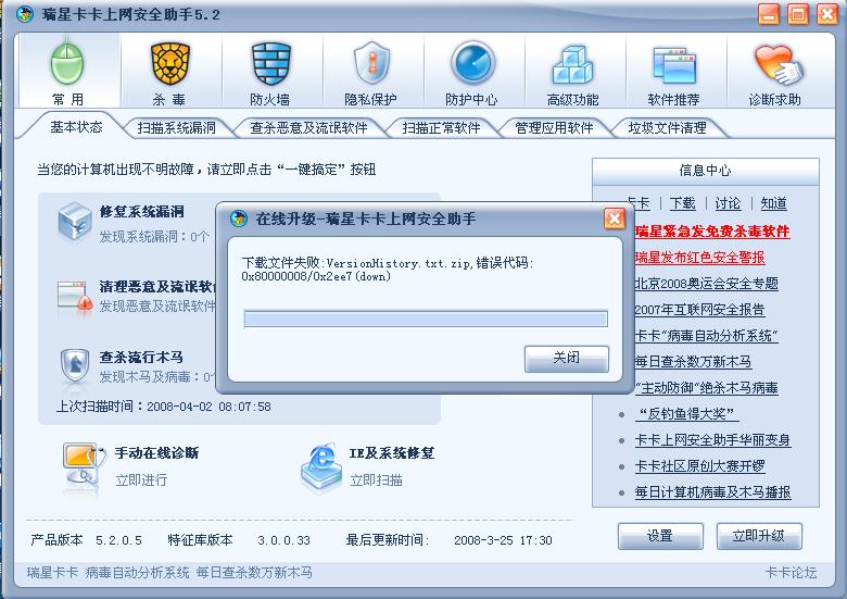 卡卡升级出问题了[提示:下载文件失败versionhistory.txt.zip,错误代码:0x80000008/0x2ee7(down)]