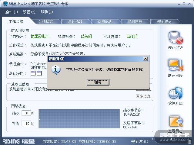 近两日瑞星卡卡不能自动升级,我以为文件出错,接着就去瑞星主页再下载一个新的安装。